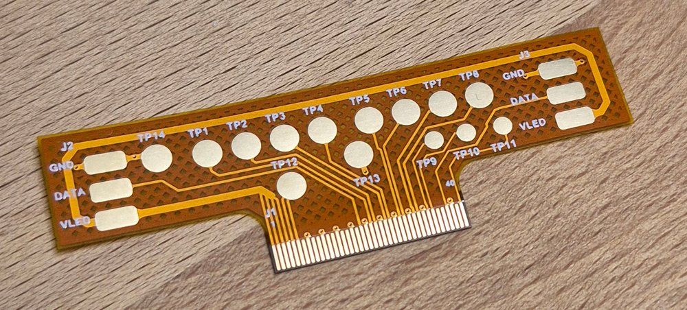 Flexible PCB breakout board for connecting a WS2812 type LED chain for easy testing and evaluation: